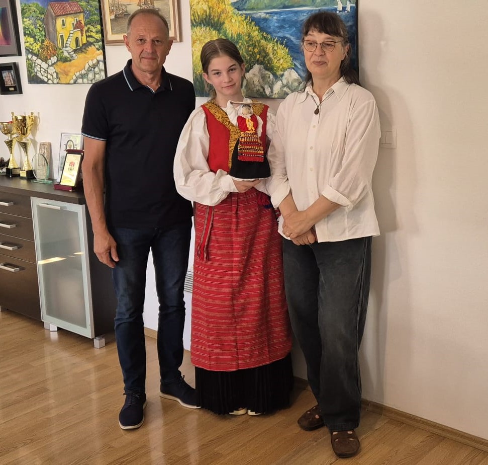 Općina Dugi Rat ponosno podržava mlade talente, a posebna zahvala ide Dariji Mladin, voditeljici učeničke zadruge, kao i mladoj članici zadruge Lauri Palavri koja je na slikama u prilogu odjevena u tradicionalnu poljičku nošnju. Načelnik ih je primio u svom uredu gdje su mu u ime zadruge predstavile skulpturu.