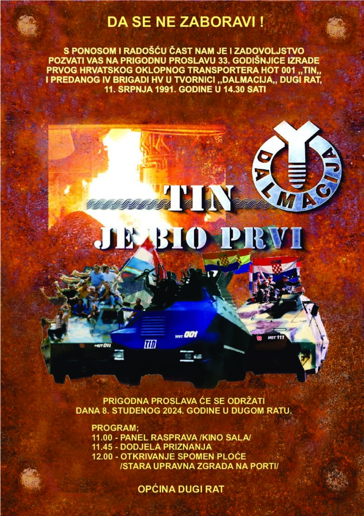 Općina Dugi Rat s velikim zadovoljstvom poziva sve mještane na obilježavanje 33. godišnjice izrade prvog hrvatskog oklopnog transportera HOT 001 “TIN”. Prigodna proslava održat će se 08. studenog 2024. g. u kino sali Dugi Rat s početkom u 11 sati.