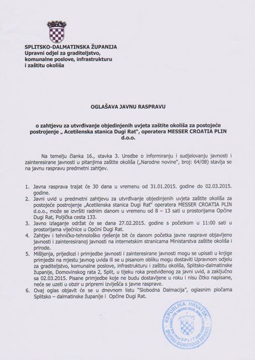 Općina Dugi Rat, općinski načelnik Jerko Roglić, dipl. ing. objavljuje